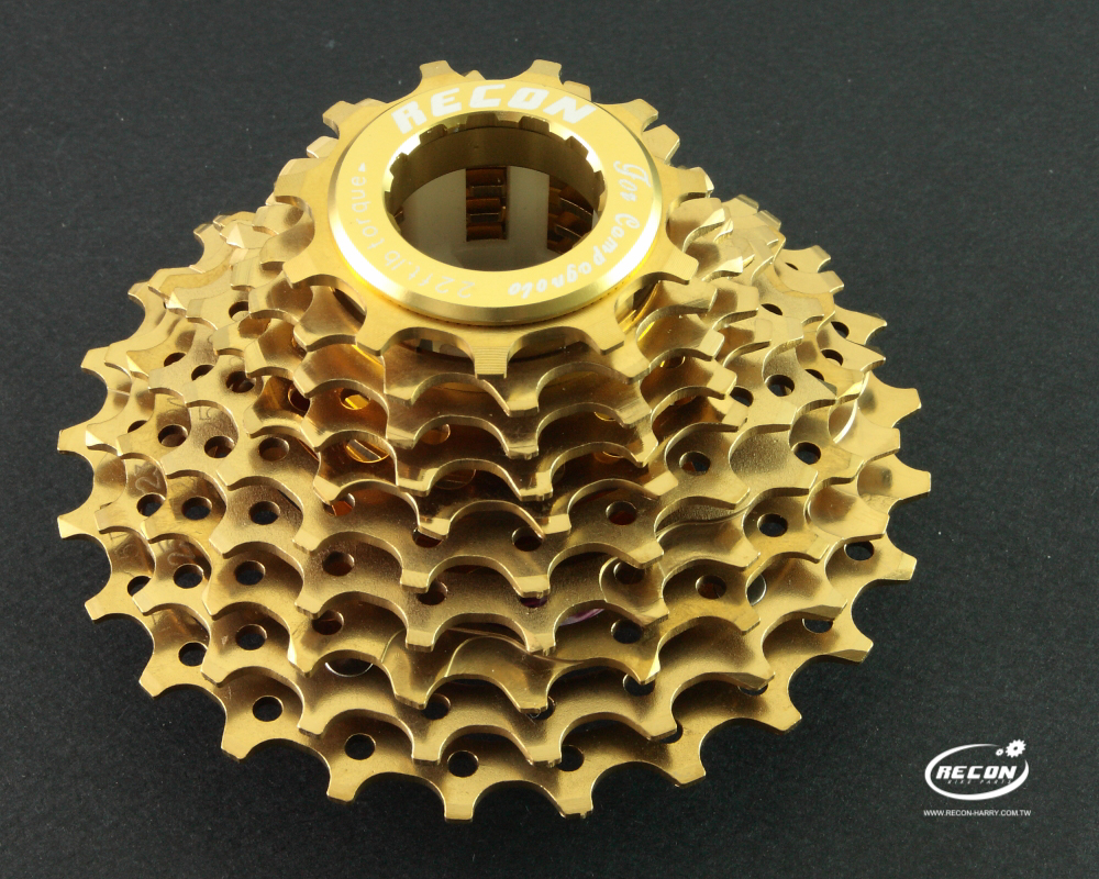 9 Titanium cogs and one steel cog, with the largest ones fitted on an aluminum spider. Machined tooth profiles improve shift speed and accuracy.